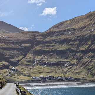 To get to Vagar Island, you also have to ride through the Vágatunnilin. This tunnel is one of many connecting the Faroe Islands, and is allowed for cyclists. It's nearly 5 km long and will take you about 100 meters below sea level. Don't worry about cycling underwater – just keep your lights on, stay on the shoulder, and keep on trucking. On the other side, a rather steep and long climb awaits that will take you across the mountain, over to Sandavágur. From there, just enjoy the scenery and follow the road to Gásadalur and the waterfall.